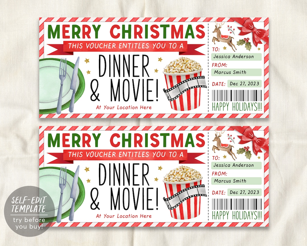 Christmas Dinner and Movie Gift Voucher Editable Template Surprise