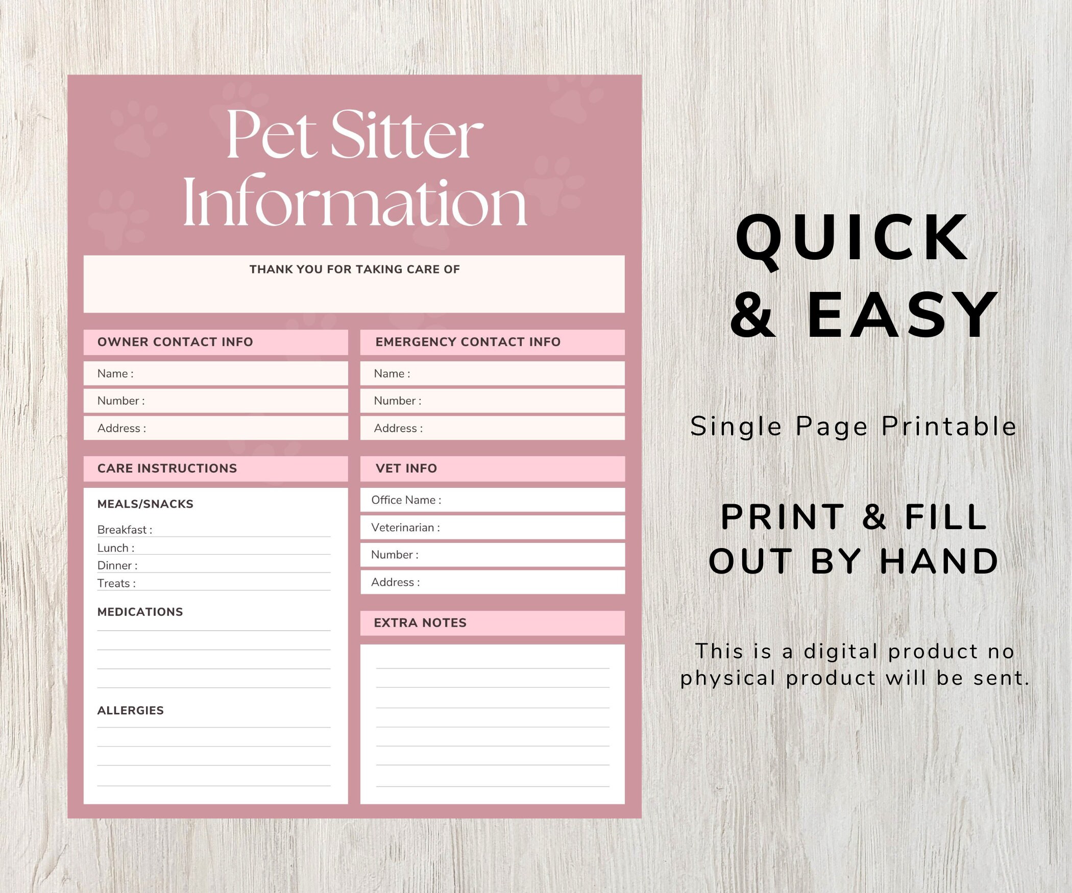Pet Sitter Information Pet Sitter Notes Pet Sitter Checklist Dog