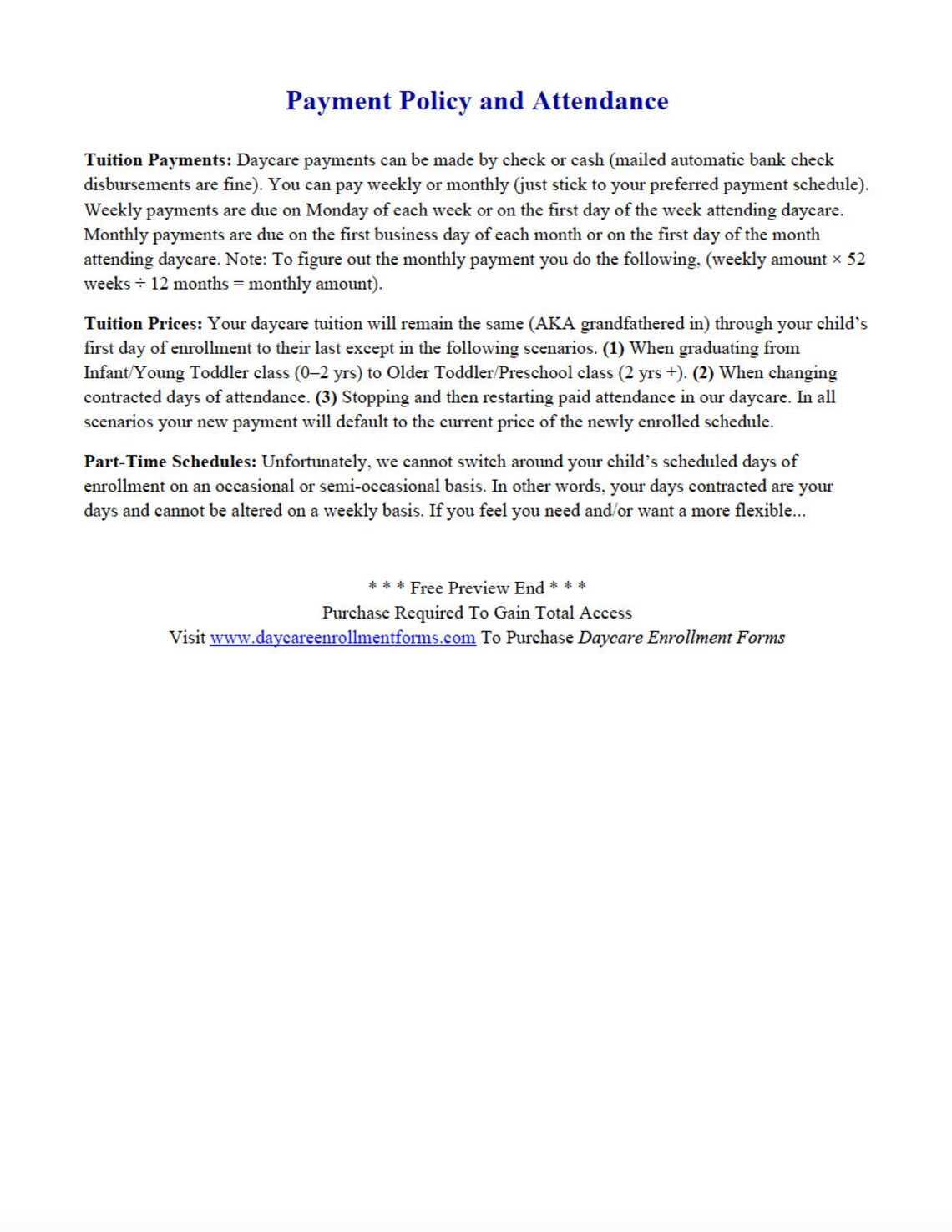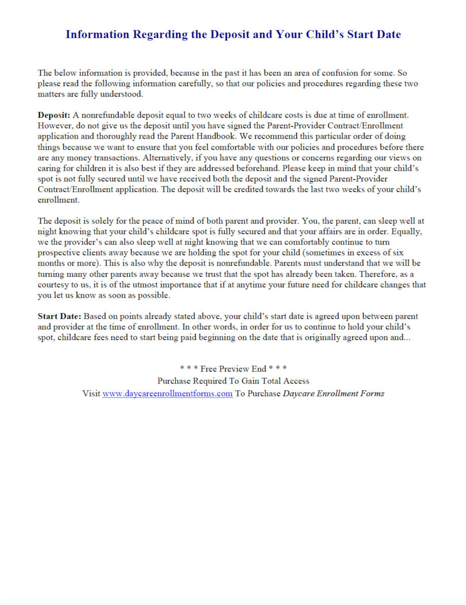 Ready to Print Daycare Enrollment Forms/ No Edit Childcare Enrollment