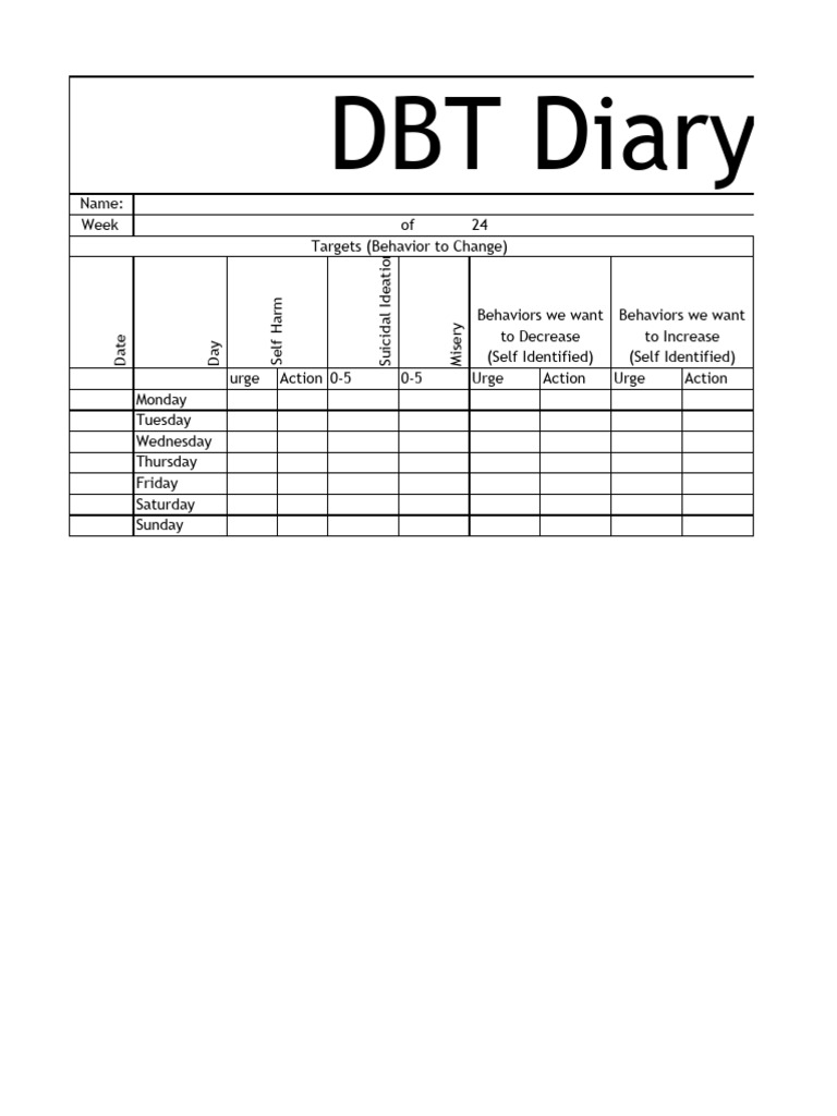 DBT Diary Card PDF Dialectical Behavior Therapy Medical Treatments