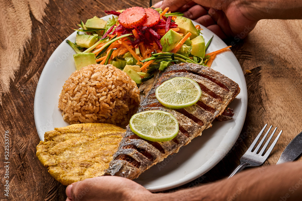 hombre agarrando pescado frito colombiano con arroz de coco y patacon y