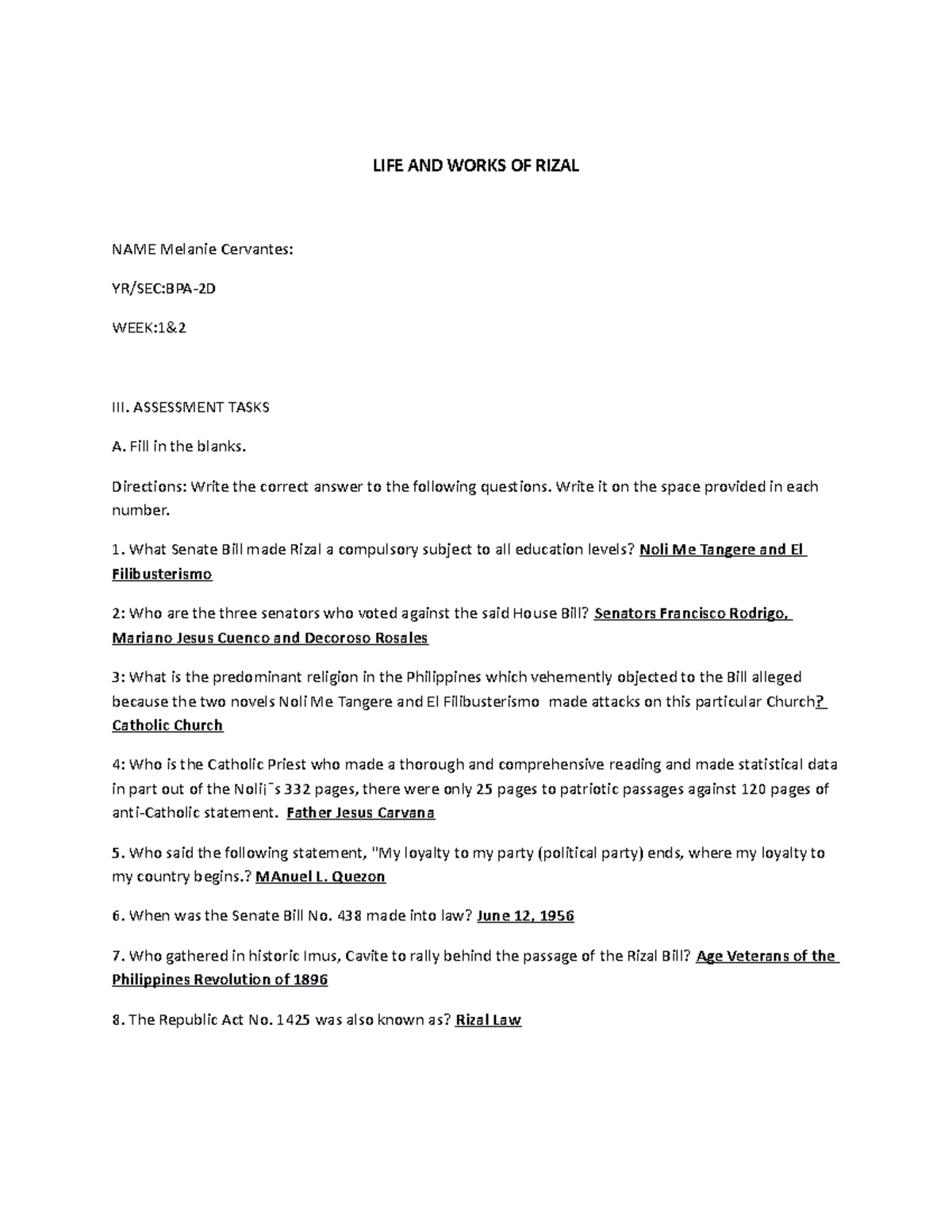 Rizal 1 2 Answer LIFE AND WORKS OF RIZAL NAME Melanie Cervantes: YR