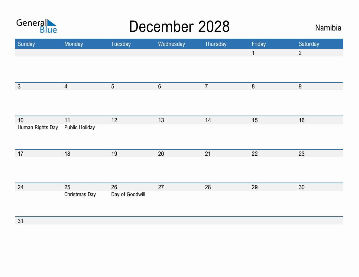 Download Free Editable Calendar December 2028 With Notes weeks start