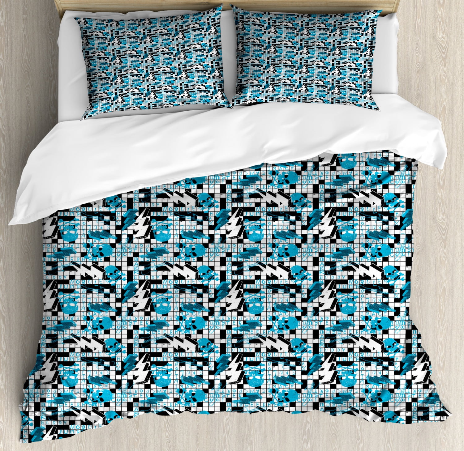 Retro Duvet Cover Set King Size Crossword Puzzle Theme with Skulls