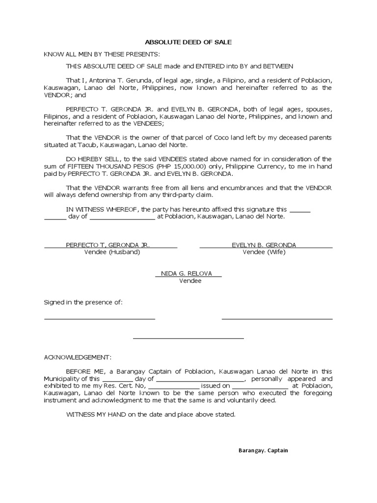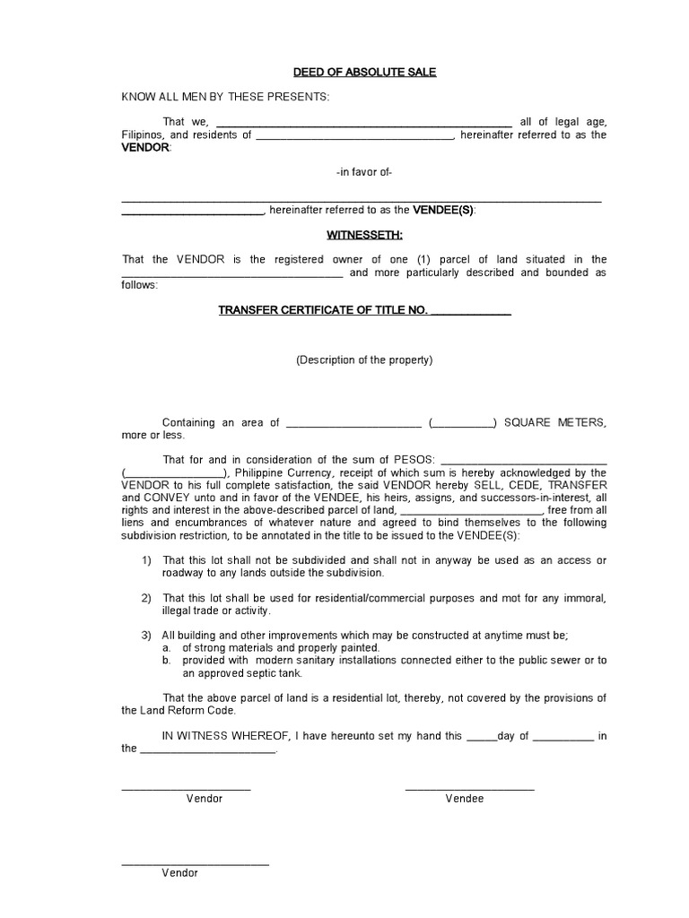 Deed Of Sale Vs Deed Of Absolute Sale Philippines Templates Sample