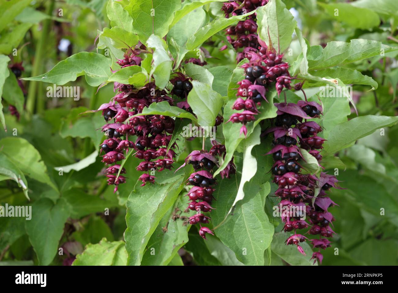 Deep purple berries forming on Himalayan Honeysuckle shrub in late