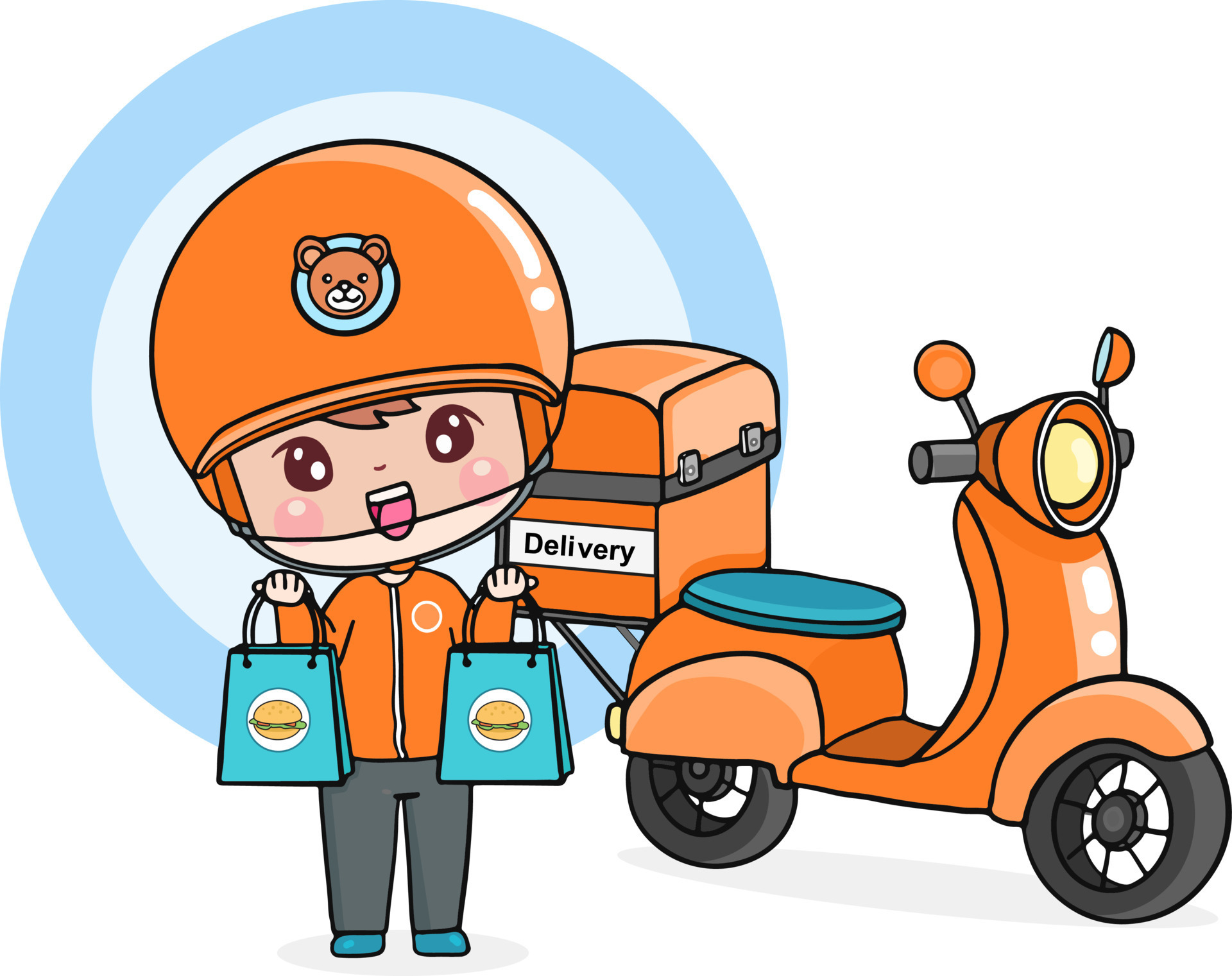 Cartoon character delivery man sending food take away ride motorbike