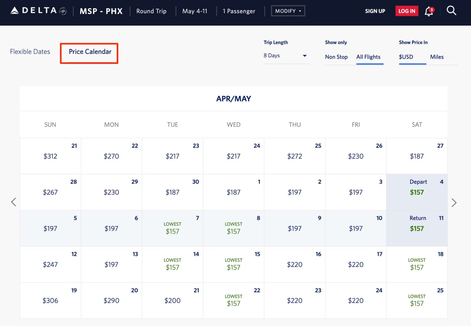 Delta Cheap Flight Calendar