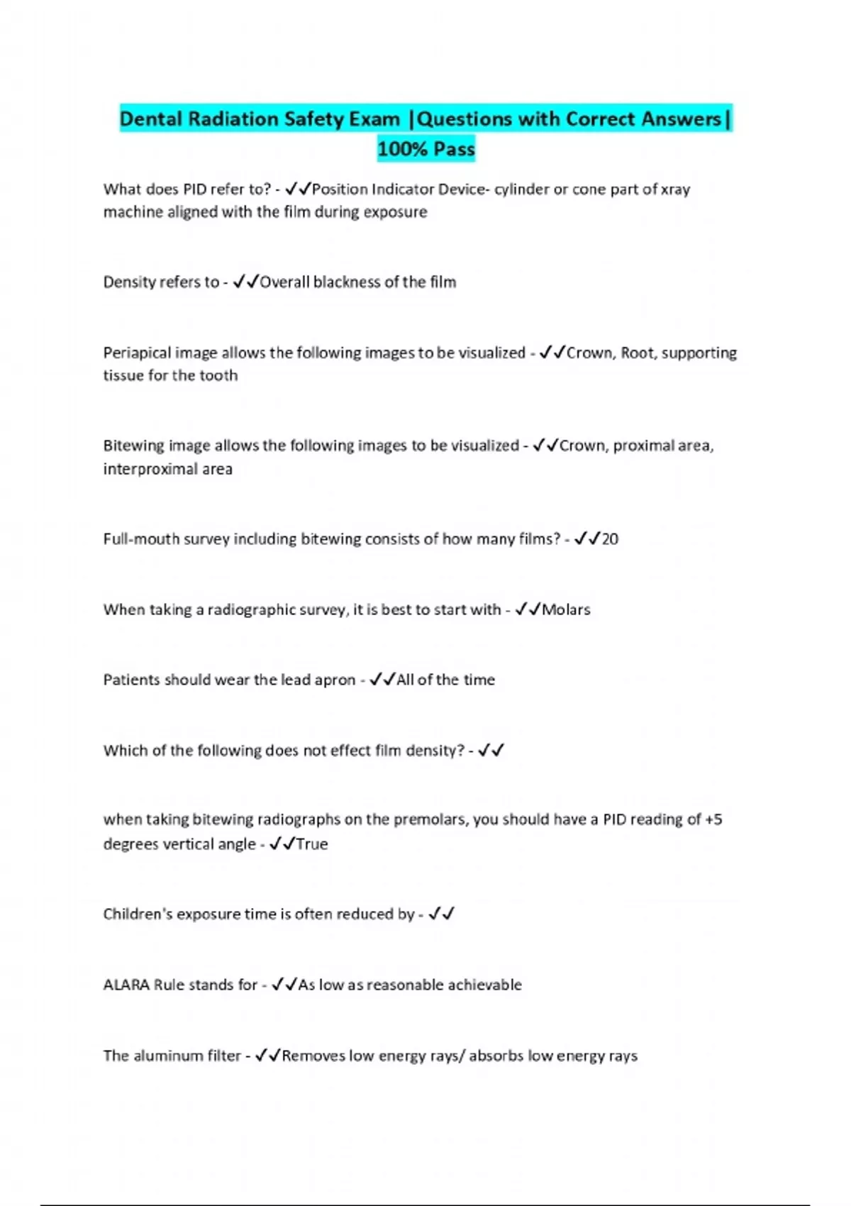 Dental Radiation Safety Exam Questions with Correct Answers 100% Pass