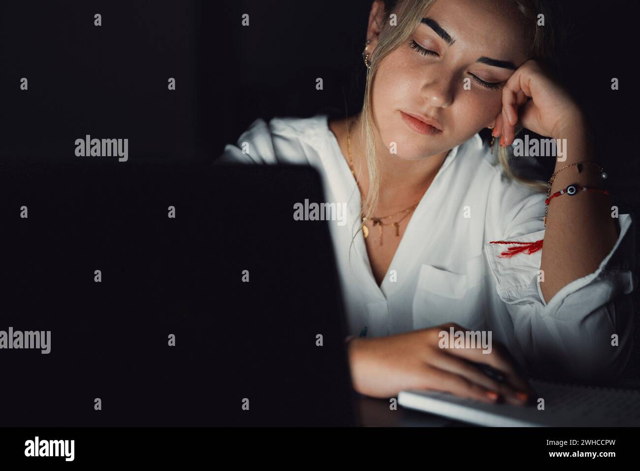 Sleep Deprived Young Woman Looking at Herself in Mirror Indoors Stock