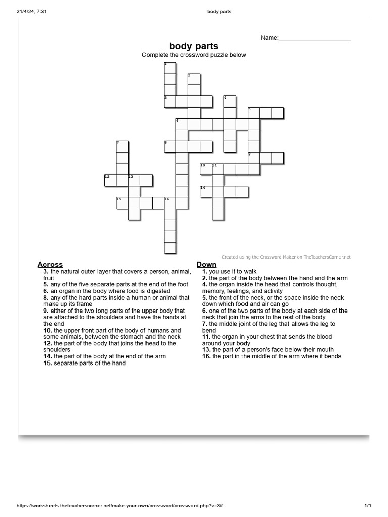 Body Parts Crossword PDF Arm Thorax
