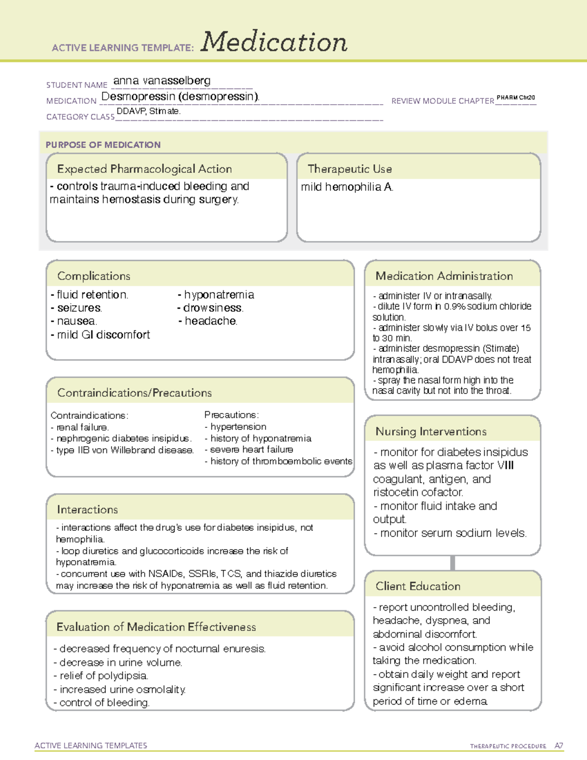 ATI Desmopressin ( Ddavp) Medication Sheet ACTIVE LEARNING TEMPLATES