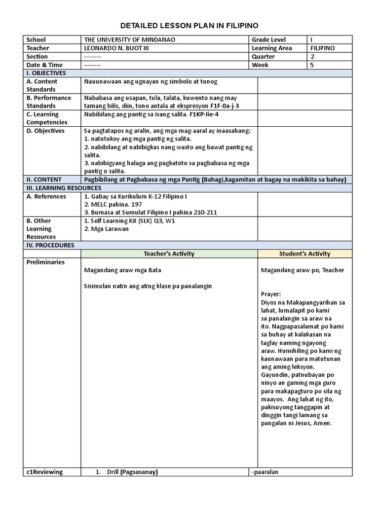 Detailed Lesson Plan Template Matatag Curriculum Subjects