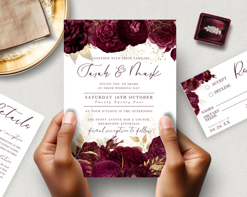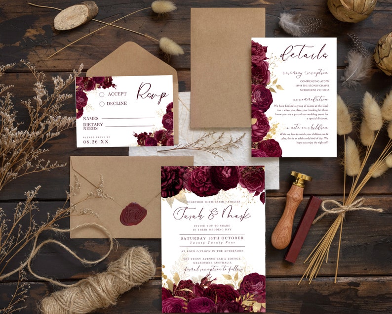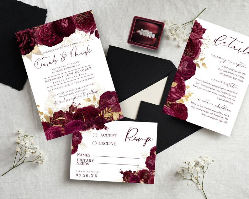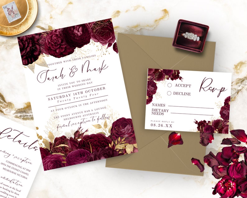 Burgundy and Gold Wedding Invitation Invitation Suite RSVP Wedding