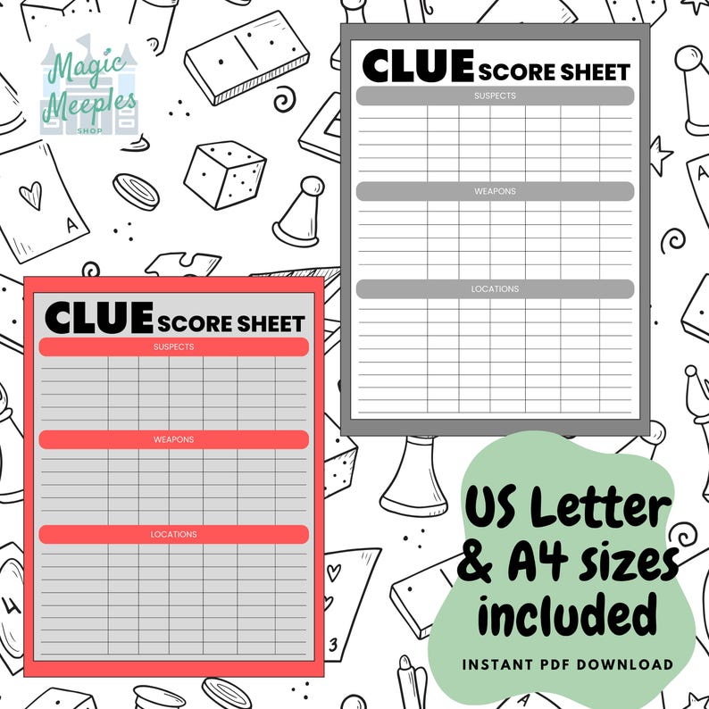 Clue Board Game Score Sheet Printable Scorecard Tracker for Easy