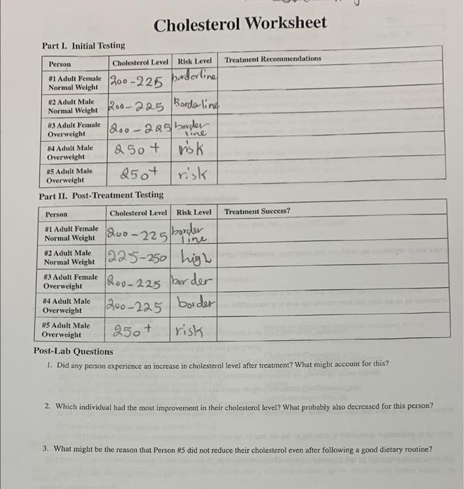 Solved Cholesterol Worksheet Part 1 Initial Testing Person Chegg com