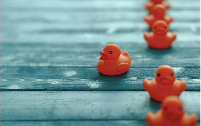 One Single Violet Rubber Duck among a Large Group of Yellow and Orange