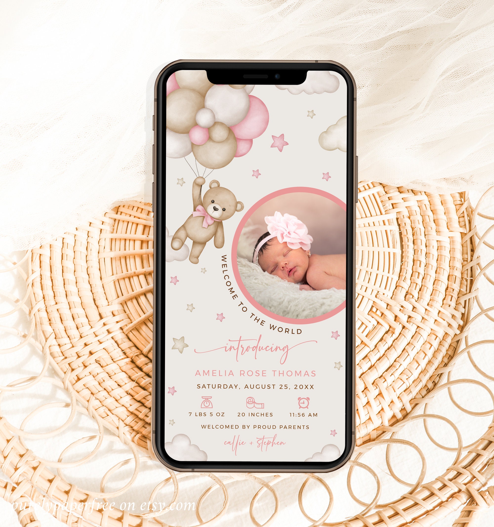 Digital Birth Announcement Girl Bear Electronic Newborn Announcement
