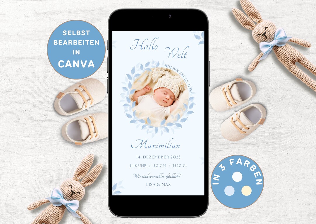 Digital Birth Announcement Boy Personalizable Send via Whatsapp Birth