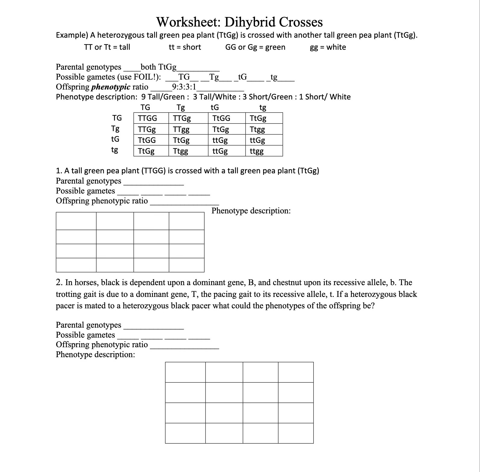 Dihybrid Crosses Worksheet