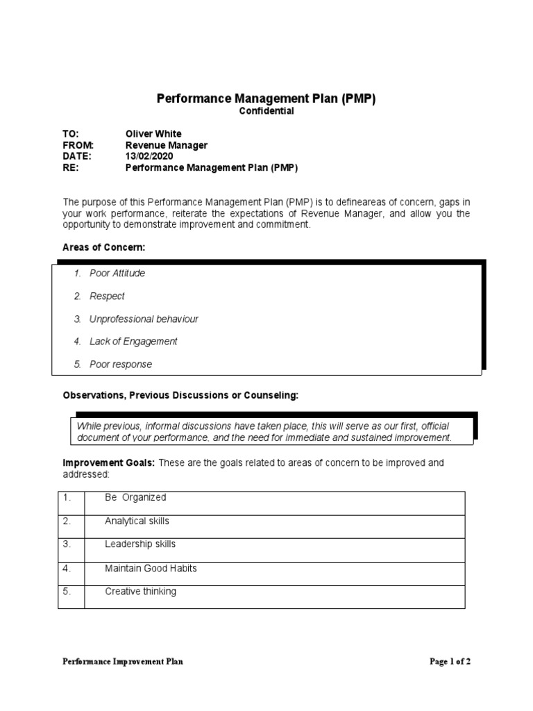 Formal Performance Improvement Plan outlining Oliver White #39 s areas of