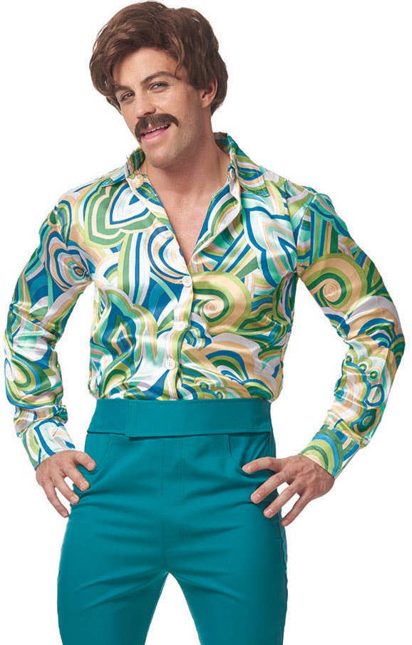 Green Satin Swirl Disco Costume Retro Mens 1970s Dude Dress Up