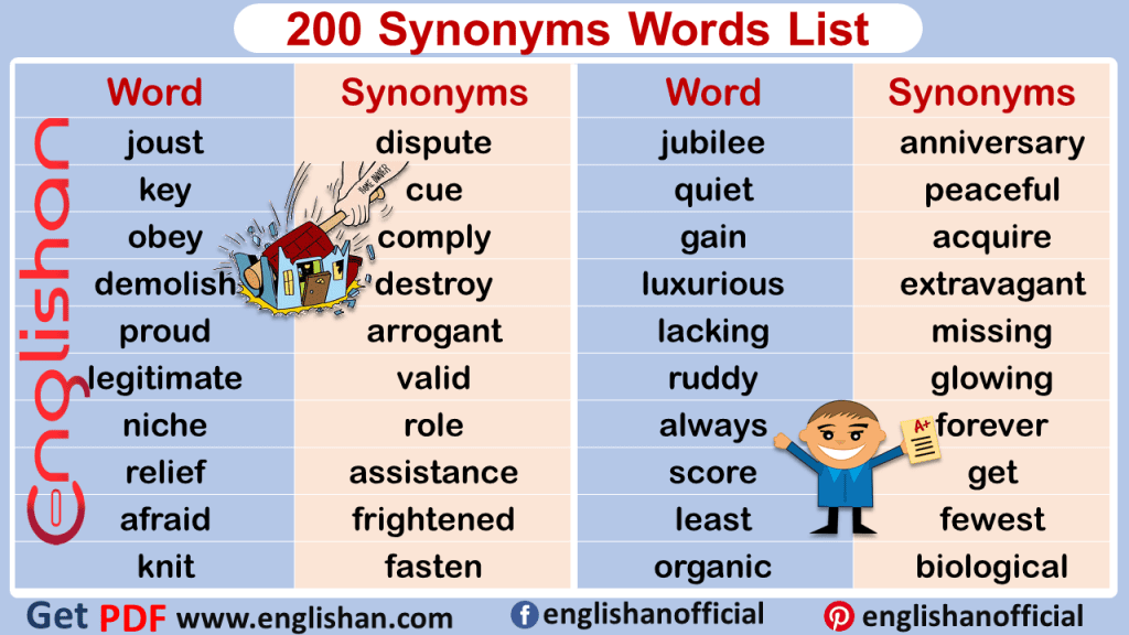 200 Synonyms Words List for Beginners Englishan