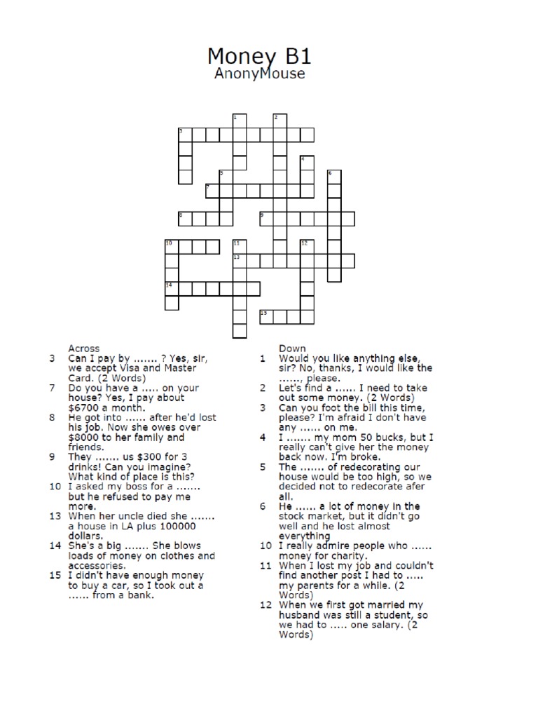 Money Crossword Puzzle All About Money Crossword Activities TPT
