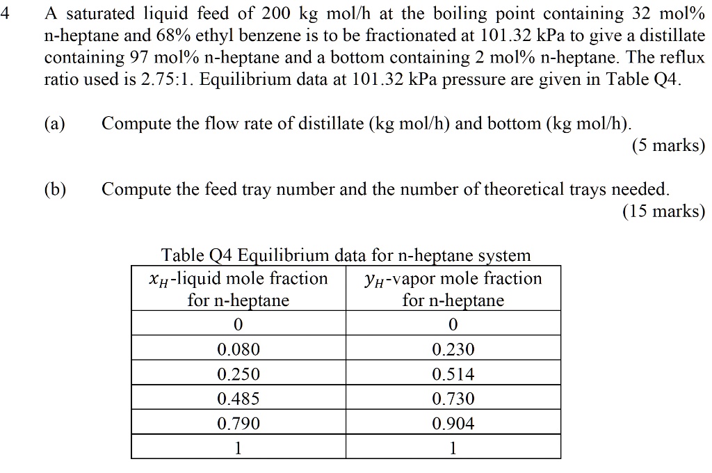 A saturated liquid feed of 200 kmol/h at the boiling point containing