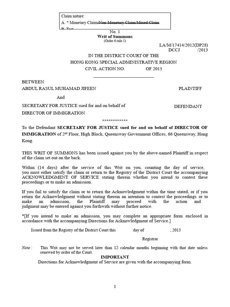 Writ Of Summons Form District Court Of The Hong Kong Special