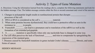 BIOLOGY: DNA RNA TRANSCRIPTION TRANSLATION MUTATIONS TEST REVIEW