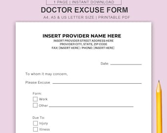 PRINTABLE Doctors Excuse Template Medical Office Forms Work Etsy