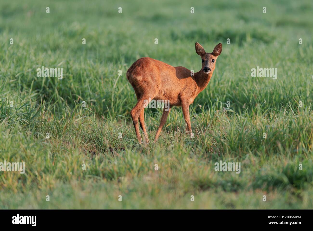 Roe deer doe in sunny meadow at dawn Stock Photo Alamy