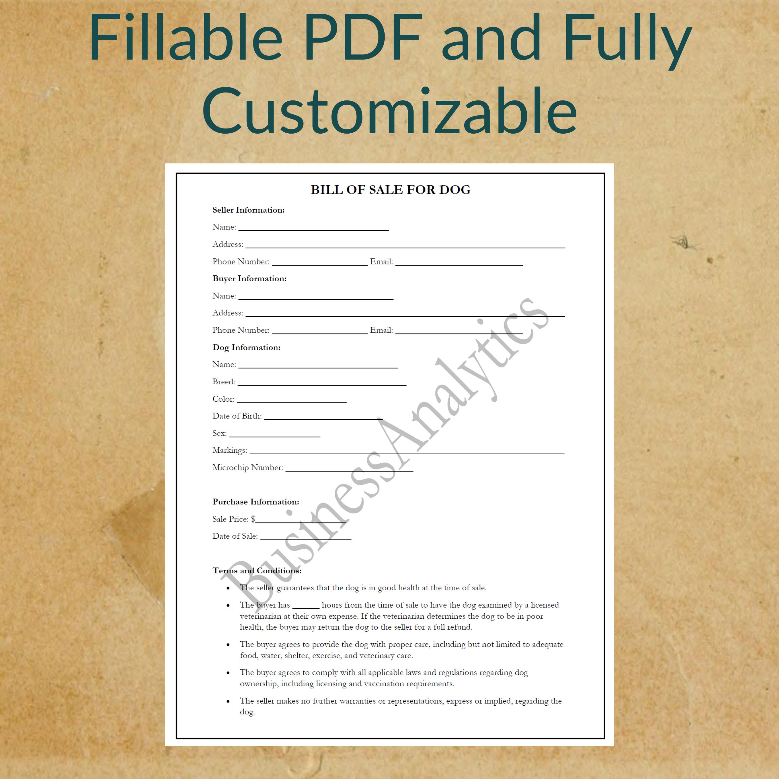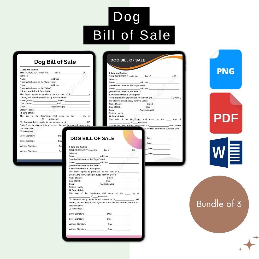 Bill of Sale for Dog Printable Fillable PDF Digital Download
