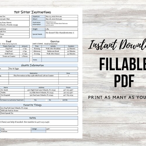 Pet Sitter Instructions Printable PDF Owner Info Template (dog Cat