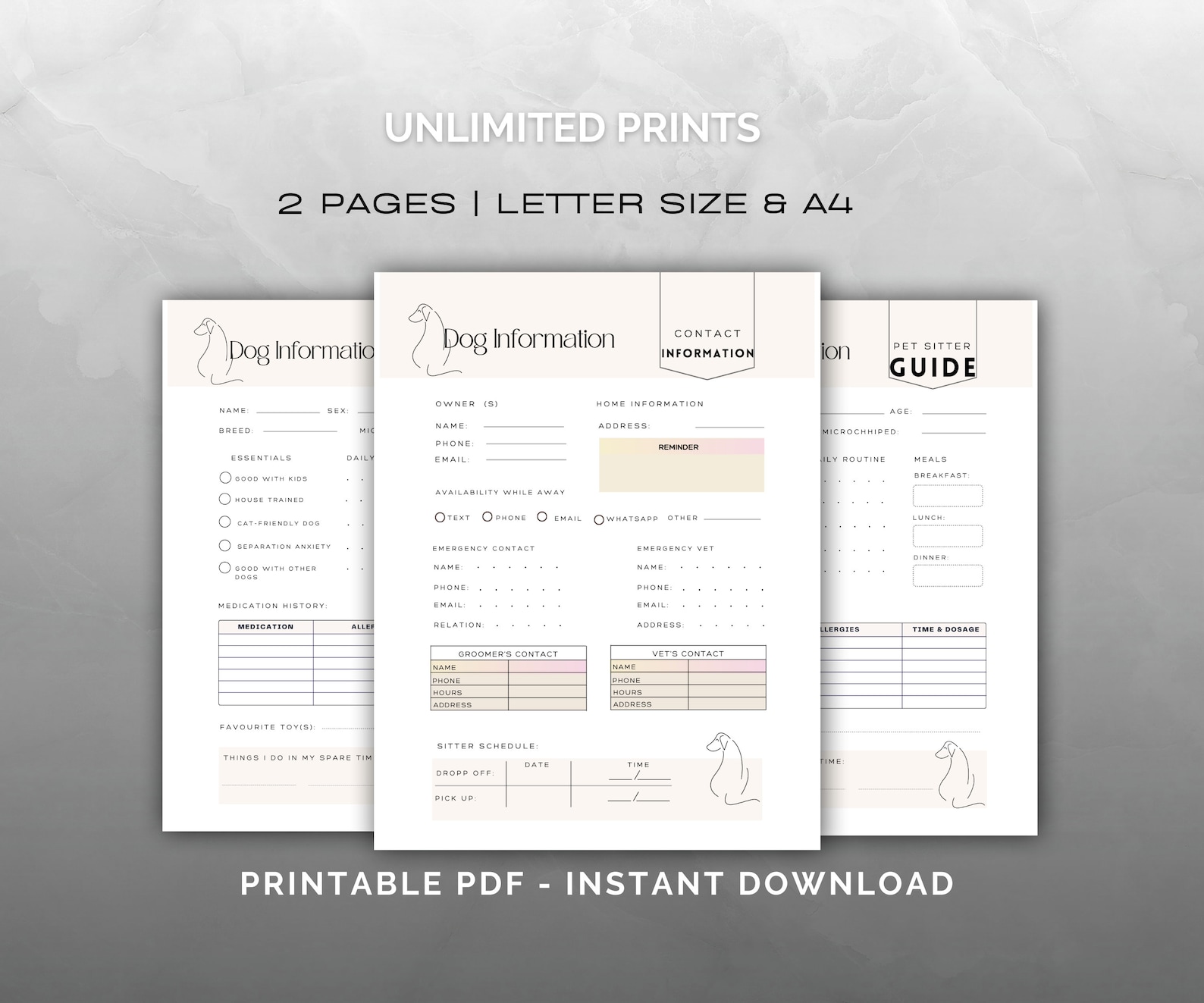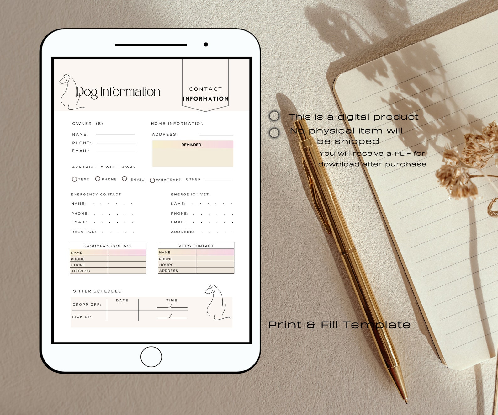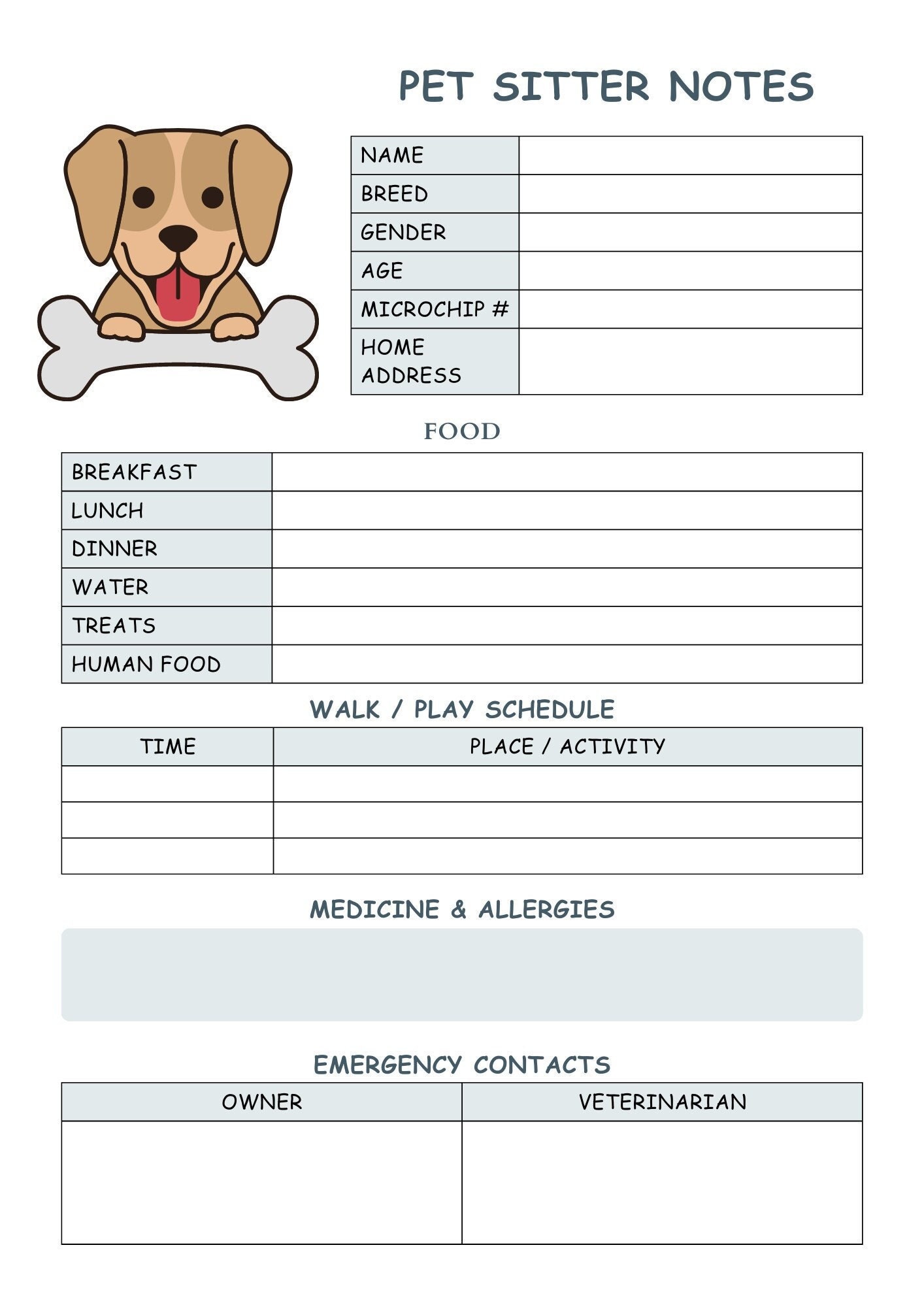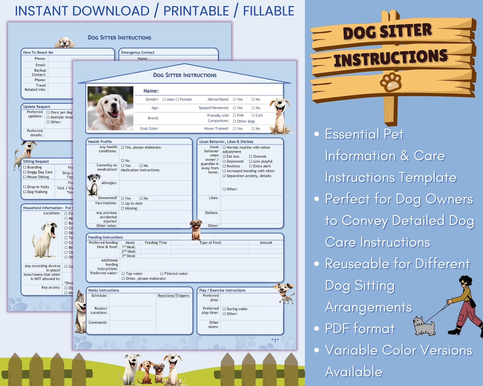 Dog Sitter Instructions Printable DIGITAL DOWNLOAD Print Fill Dog