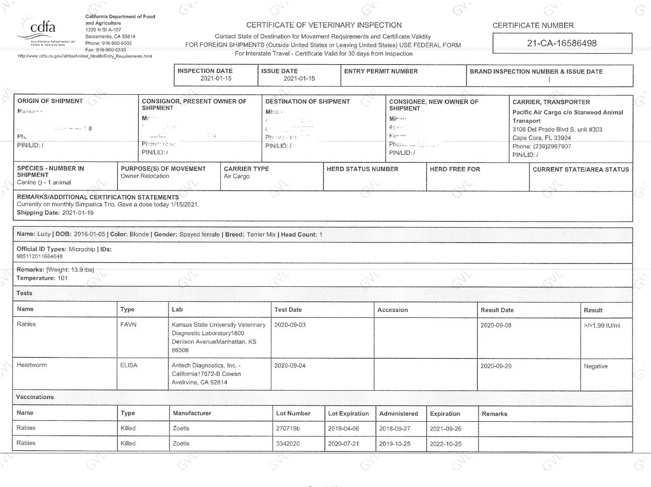 IATA Veterinary Certificate For Domestic International Airline Travel