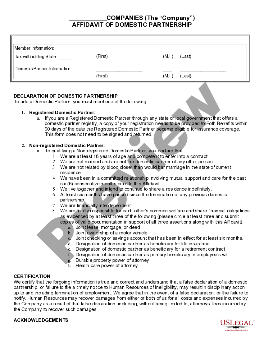 Florida Affidavit of Domestic Partnershiip US Legal Forms