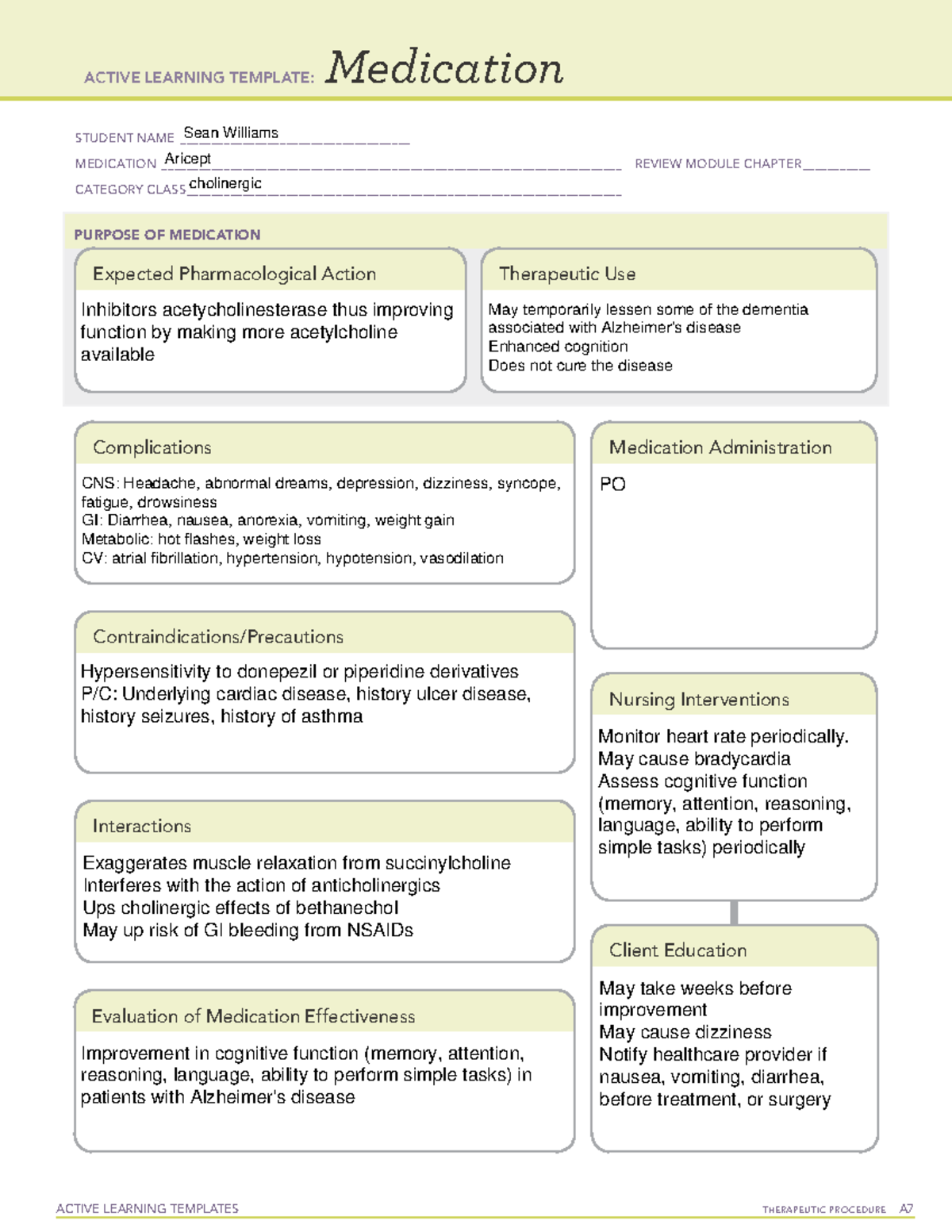 ATI Medication Template: Aricept (Donepezil) Active Learning Guide