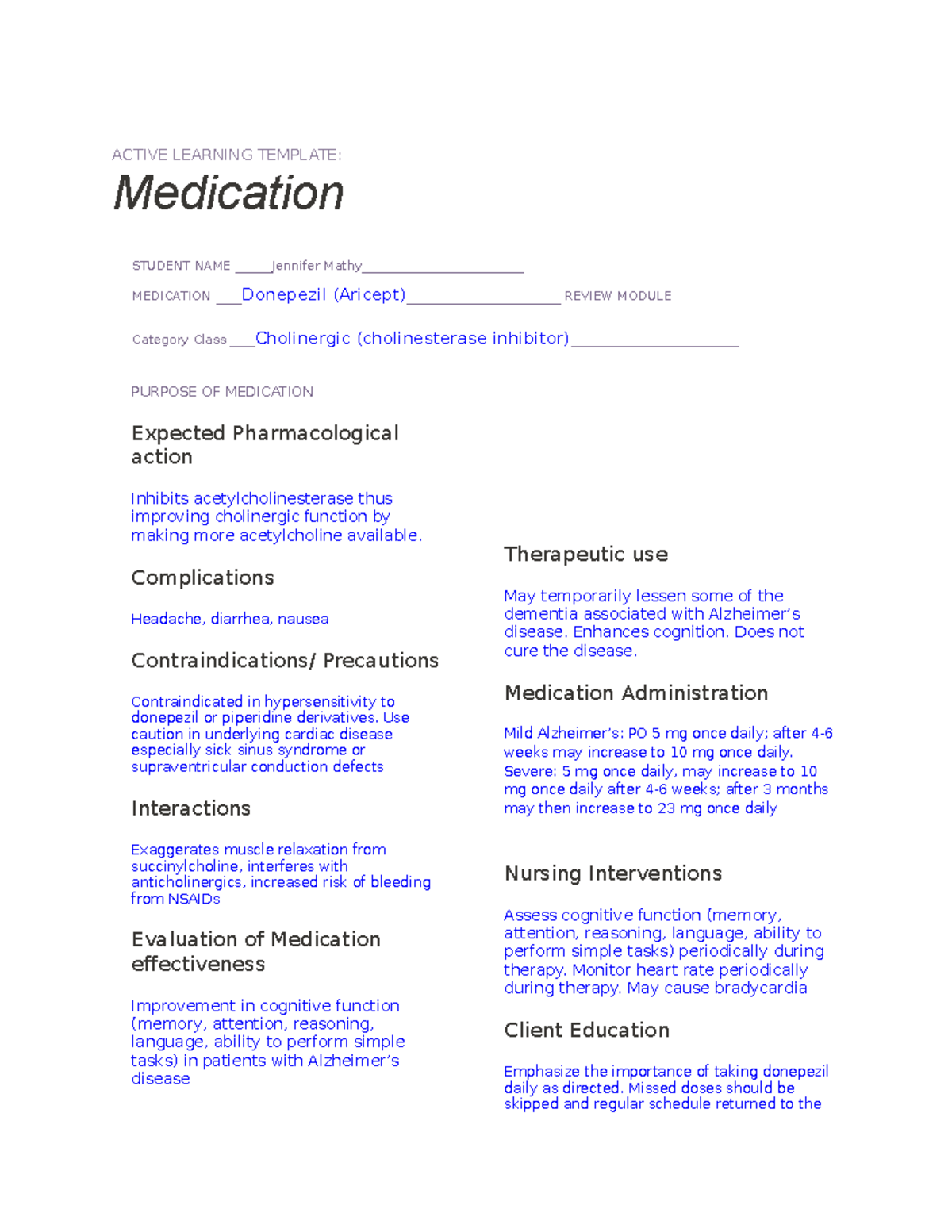 Donepezil Med Template ACTIVE LEARNING TEMPLATES Medication STUDENT