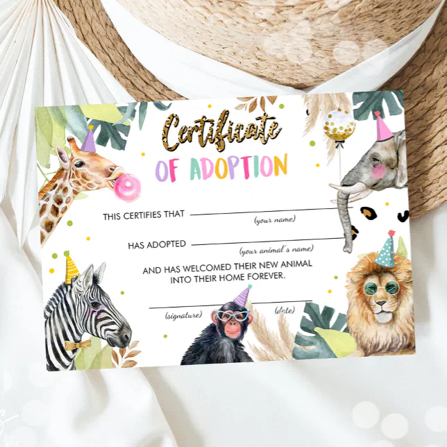 Adopt an animal adoption certificate jungle birthday printable neutral