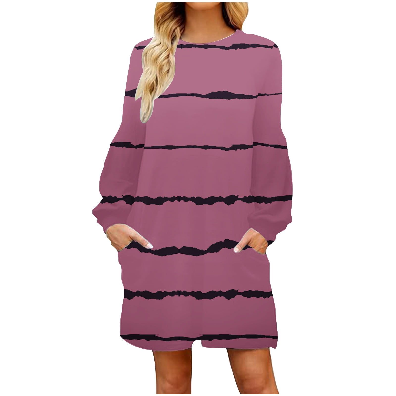 Cmfcve Women #39 s Striped Dresses Long Sleeve Round Neck Printed Midi
