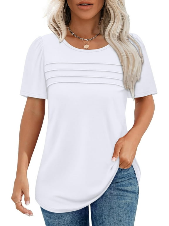 SHEWIN Blouses for Women Dressy Casual Summer Puff Ruffle Short Sleeve