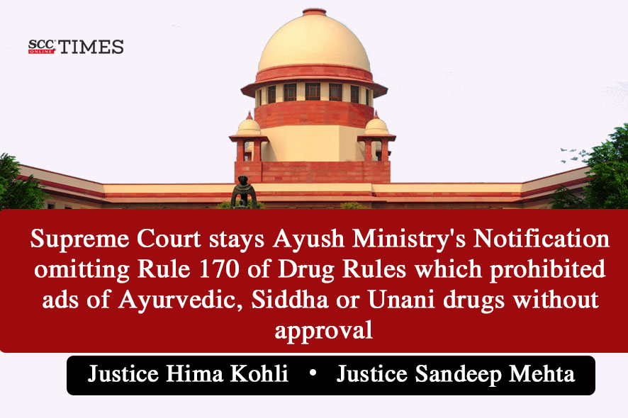 SC stays Notification omitting Rule 170 of Drug Rules which prohibited