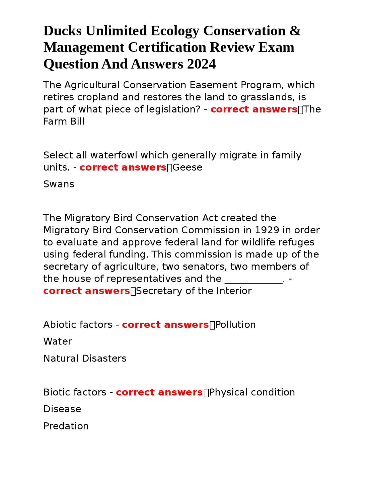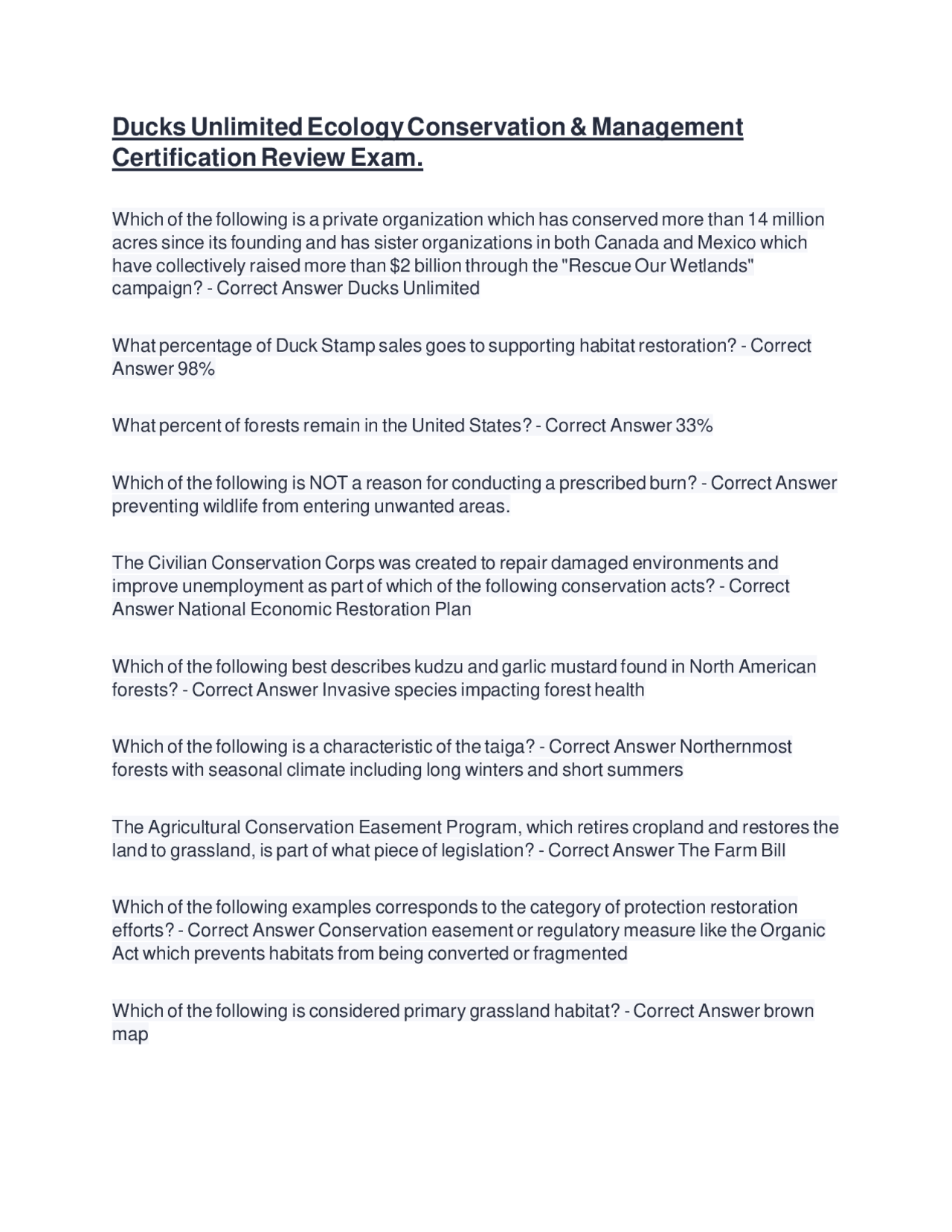 Ducks Unlimited Ecology Exam Questions and Complete Solutions Exams