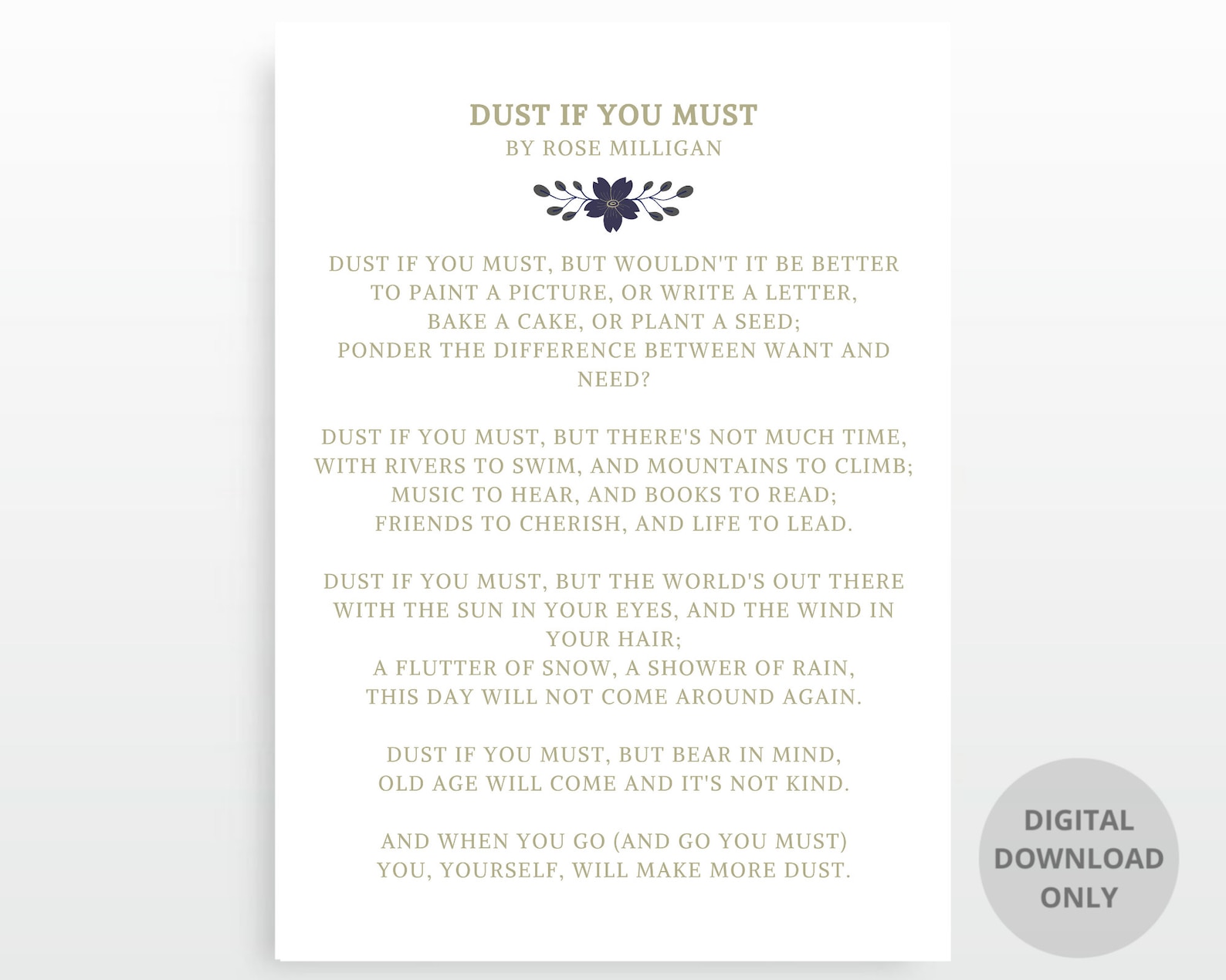 Dust If You Must Poem by Rose Milligan Printable Digital Download