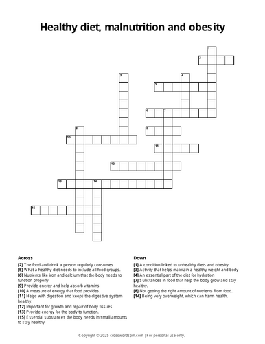 Balanced Diet Crossword Puzzle Worksheet Activity Teaching Resources