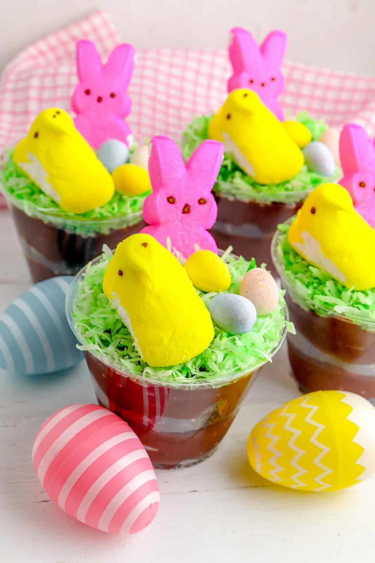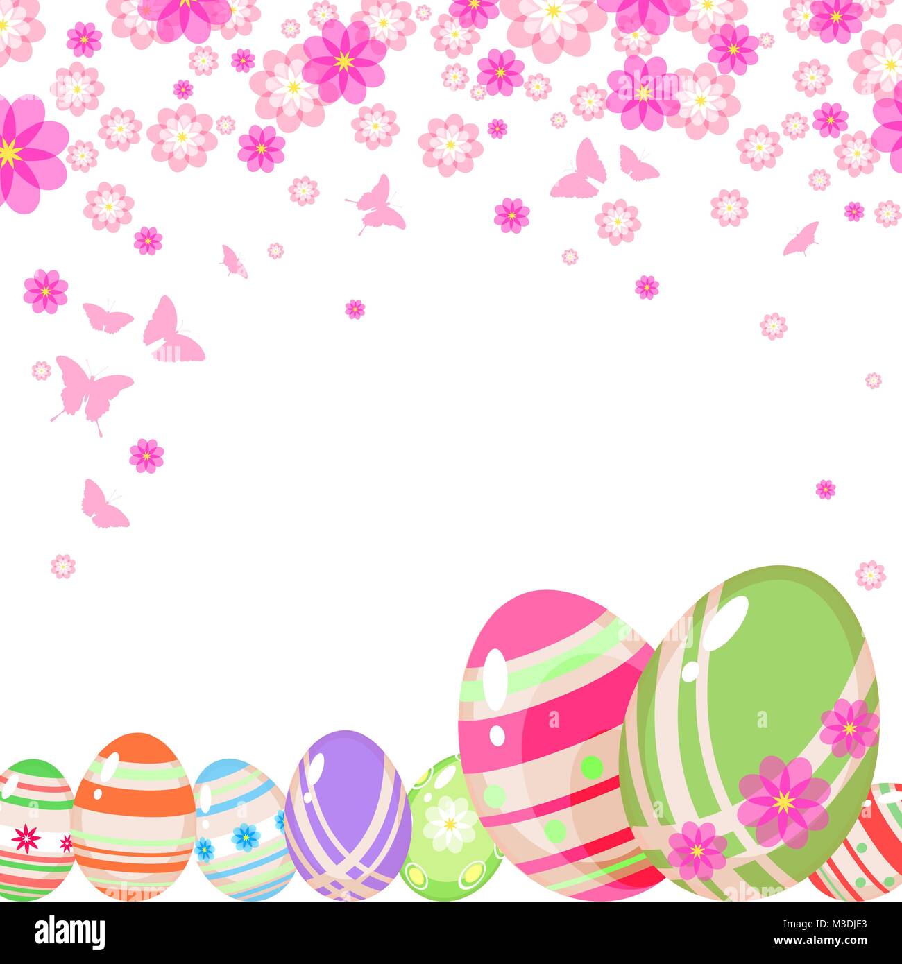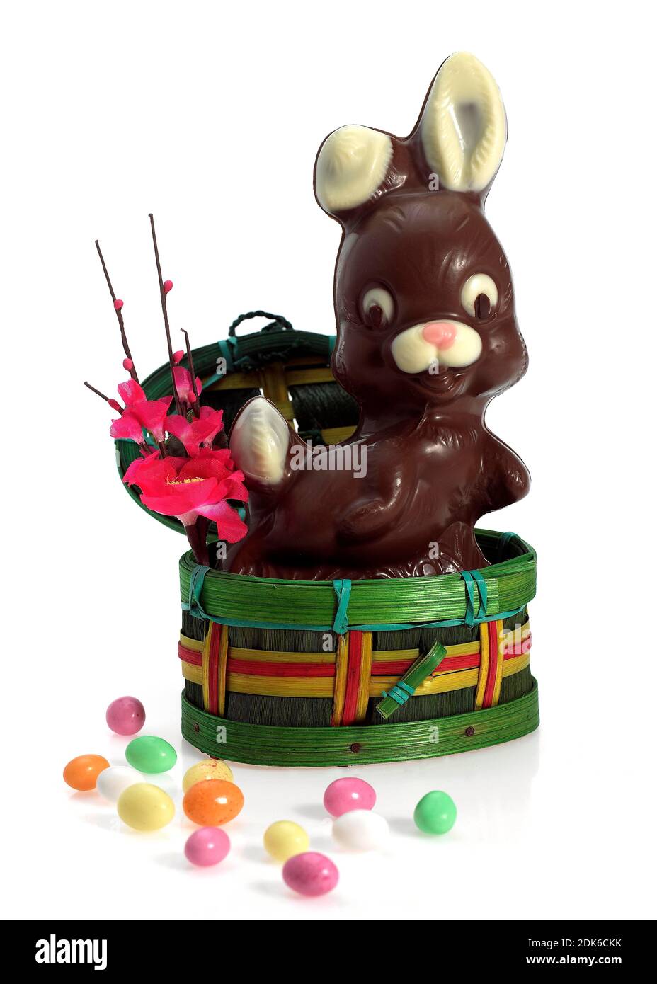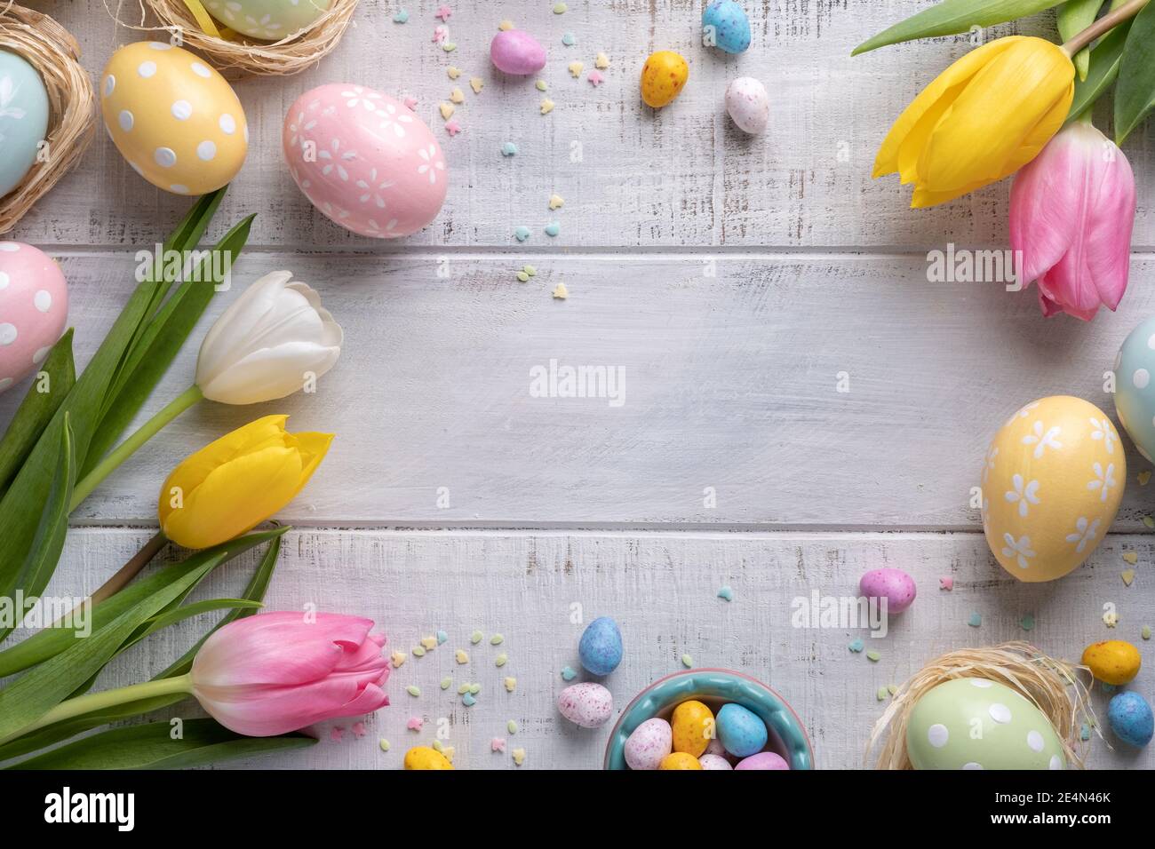 Happy easter background with bunnies eggs candies flowers Stock Photo