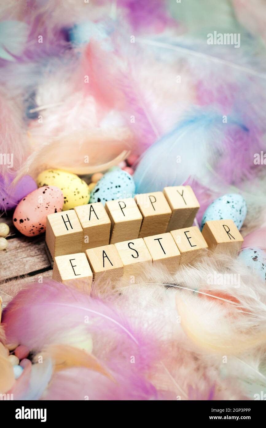 Happy Easter written with wooden cubes surrounded with beautiful pastel
