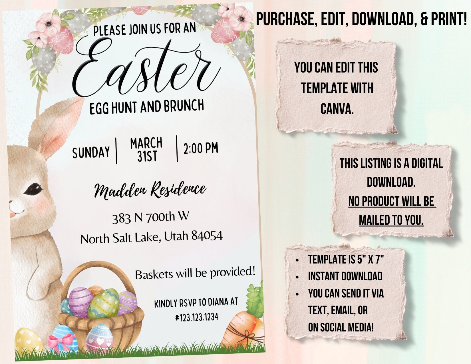 Easter Brunch and Egg Hunt Invitation Template Printable Spring Bunny
